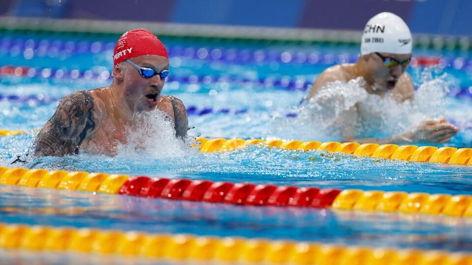 Adam peaty of britain looks on.